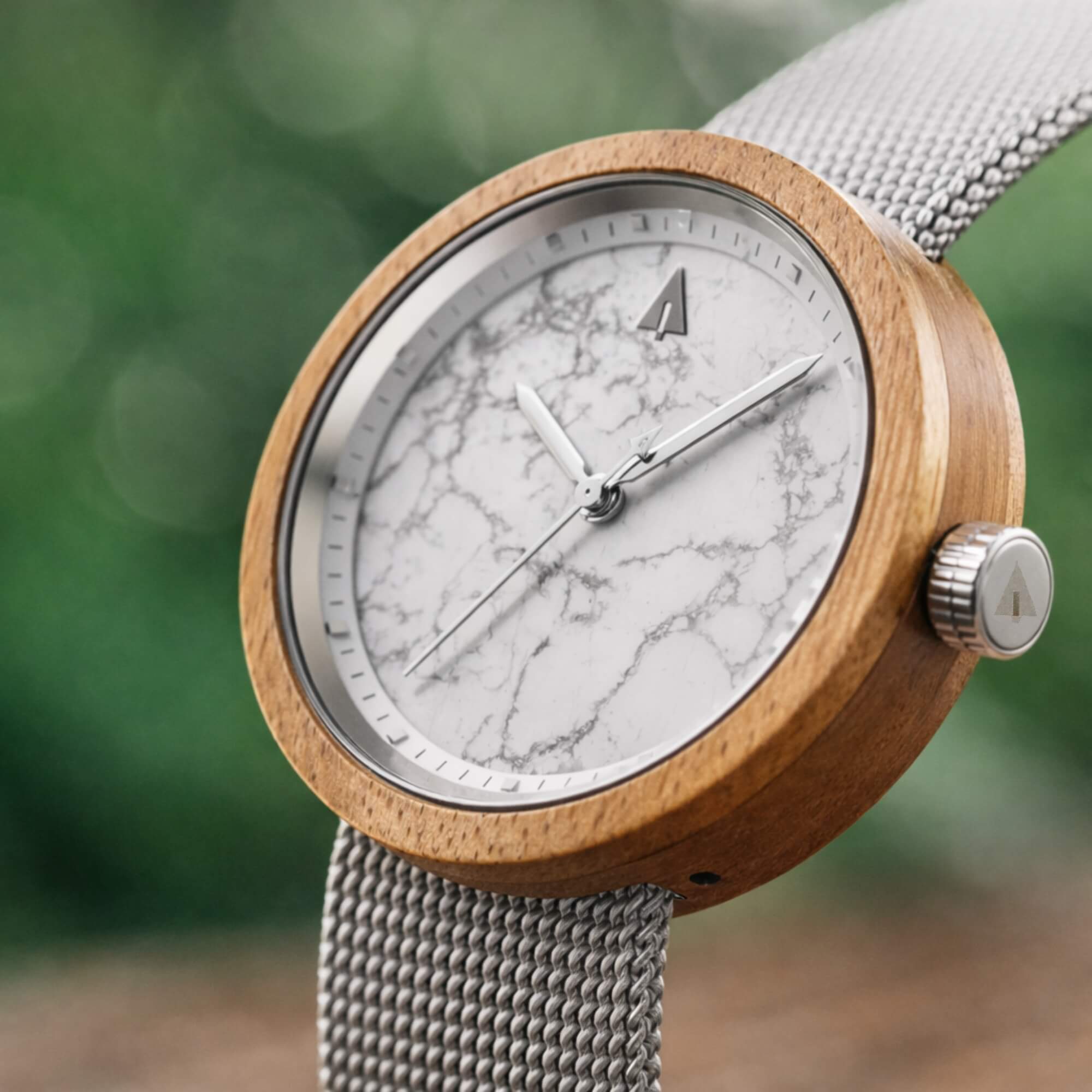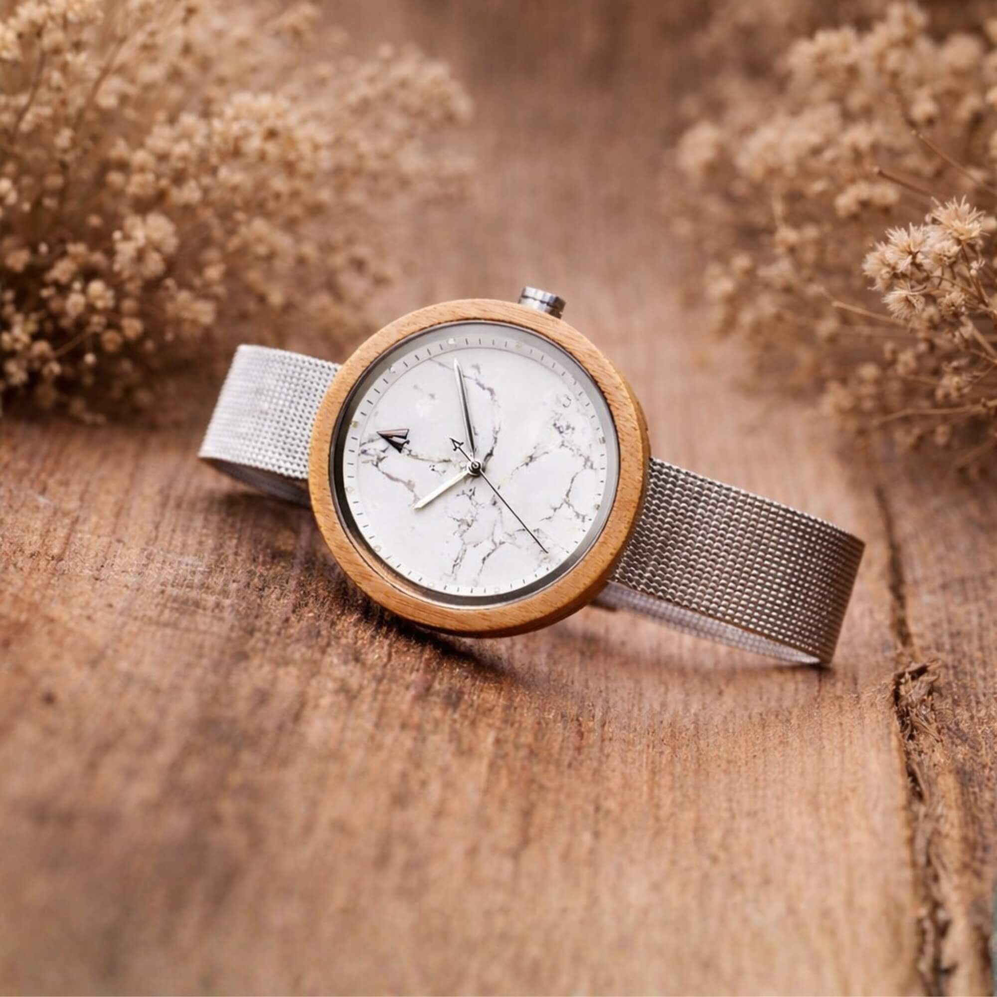 The Theory Silver Bamboo Marble is a white dial watch that blends natural stone and warm wood into a piece made for everyday wear. Its oval bamboo case frames a genuine white marble dial, each one showing its own veining and pattern. Paired with a slim silver mesh strap, it offers contrast in both material and texture.